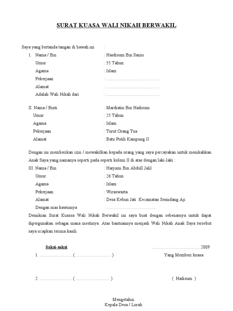 Surat Keterangan Pengantar Menjadi Wali Nikah ini memiliki format sebagai berikut. Documents Similar To Contoh Surat Kuasa Wali Nikah. 12 Contoh Surat Pengalaman Kerja yang Benar dan Terbaru.