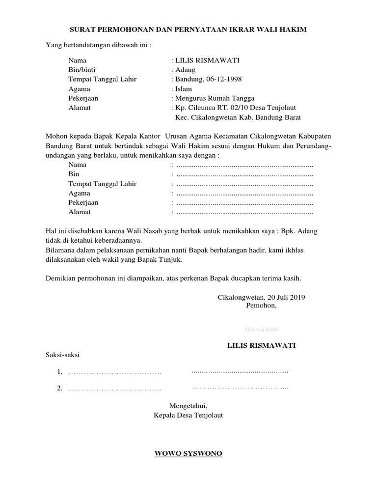 Surat Permohonan Dan Pernyataan Ikrar Wali Hakim Pdf